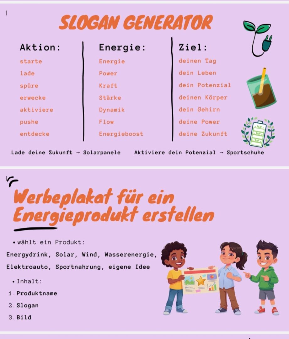 Tijekom radionice učenici su se upoznali s osnovnim obilježjima slogana, njihovom svrhom u komunikaciji i ulogom u oglašavanju i medijima. Kroz primjere i vođene aktivnosti razvijali su vlastite ideje, osmišljavali slogane i vizualno ih oblikovali, povezujući na kreativan način jezik, medije i temu energije.