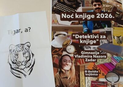 Jučer smo u našoj knjižnici obilježili Noć knjige. Po danu! Knjižničar Ante i profesorica Hrvatskog jezika Ivana, osmislili su igru ,,Detektivi za knjige” u kojoj su se međusobno natjecala dva razreda, 4. b i 4. d. Troje učenika detektiva predstavljali su svoj razred, a zadatak im je bio prepoznati lektire u zagonetkama.