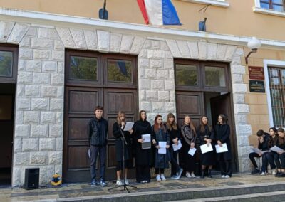 Osvrćući se na sve ono što je bilo i braneći isto od zaborava, naši učenici recitirali su snažne riječi izašle iz pera hrvatskih književnika poput Antuna Gustava Matoša, Ivana Vidovića, Jelene Alfirević Franić, Snježane Vučković i Siniše Glavaševića. Poseban obol ovom svečanom programu dali su autorski tekstovi naših učenika koji tematiziraju Vukovar i Škabrnju, život, smrt, ljubav, snove, čežnje, strahove i sve ono što povezuje vrijednost žrtve kakvu su podnijeli sinovi i kćeri Vukovara i Škabrnje. Svoje viđenje strahota rata opisala je naša učenica Mare Fazinić u pjesmi „2 393 dana“, dok je učenica Gabrijela Lily Surać napisala prozni tekst naslova ,,Divlja trava“ kojim naglašava važnost mira. Aktualnom tematikom francuskoga viteza, Jeana-Michela Nicoliera bio je zaokupljen i učenik Roko Mate Uskok koji je na tu temu napisao pjesmu „Ponovni susret“ podsjećajući da ljudskost ne poznaje granice ni zastave.