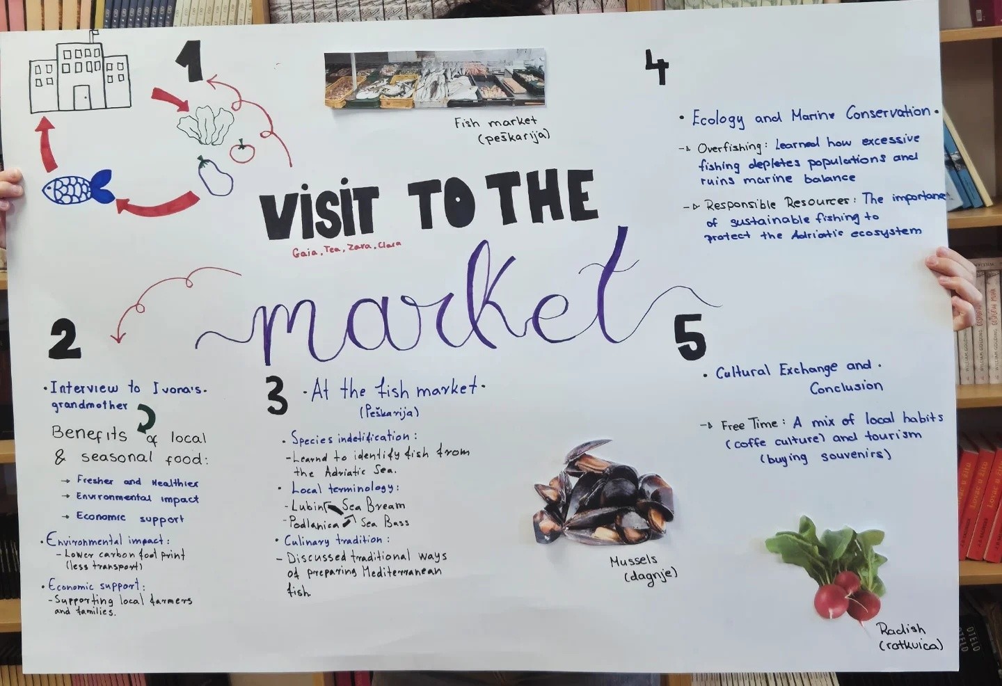 Jutarnji sati započeli su radno u školskoj knjižnici. Pod vodstvom nastavnika Ane Burele, Sanje Fabac i Mate Lonića te njihovih španjolskih kolega, učenice su u mješovitim grupama izrađivale edukativne plakate kojima su prikazale ključne činjenice koje su naučile tijekom tjedna, pokrivajući različite teme iz područja ekologije, biologije i kulturne baštine. Paralelno s izradom plakata, marljivo su se dovršavale digitalne prezentacije i montirale zajednički videozapis koji je objedinio najljepše trenutke, fotografije i snimke njihovih zajedničkih aktivnosti.