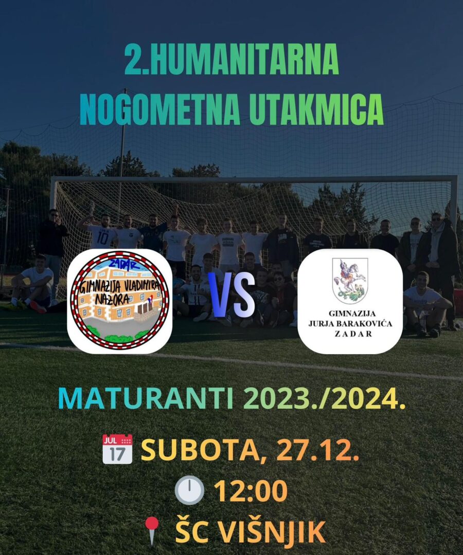 Drugu godinu zaredom, ista ekipa bivših gimnazijalaca će odigrati humanitarnu nogometnu utakmicu. Utakmica će se odigrati 27.12. u 12 sati na velikom nogometnom terenu ŠC-a Višnjik. Za vrijeme utakmice svi će biti u mogućnosti donirati novac, a svi prihodi bit će donirani zadarskom caristasu! Jako smo sretni i ponosni na broj ljudi i donacija koji smo prikupili prošle godine i iskreno se nadamo da ćemo ove godine nadmašiti sva očekivanja.