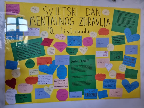 Danas, 10. listopada, smo u našoj školi obilježili Svjetski dan mentalnog zdravlja. Učenici trećih razreda pod vodstvom profofesorice Maje Kokorić Škara pisali su poruke podrške te su ih podijelili učenicima i djelatnicima naše škole, a izradili smo i plakat koji se nalazi u hodniku.