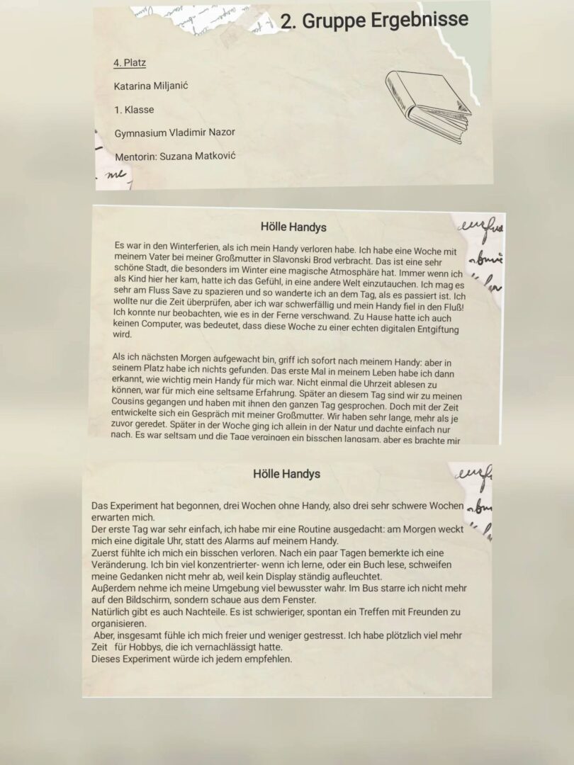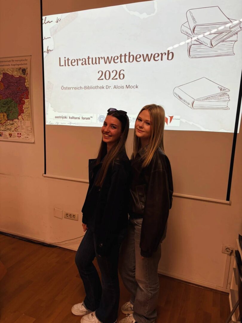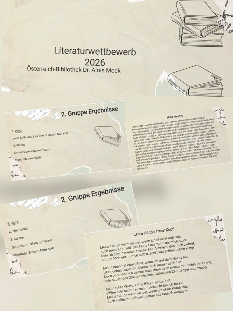 Prvo mjesto osvojile su Lea Sherin Hasan Matacin i Leah Bolle (2.d), drugo mjesto osvojila je Lucija Uzelac (3.e), treće mjesto osvojio je Andrej Barić (3.e), dok je četvrto mjesto osvojila Katarina Miljanić (1.c). Tema ovogodišnjega natječaja bila je „Handyentzug – Gedankenexperiment“, a naši su učenici svojim literarnim radovima pokazali kreativnost, originalnost i izvrsno poznavanje njemačkoga jezika. Dodjela nagrada i predstavljanje radova sudionika održani su 23. travnja 2026. godine, povodom Svjetskoga dana knjige, u Austrijskoj knjižnici „Dr. Alois Mock“.